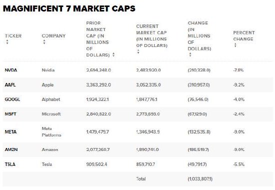 在周四的交易中,美股“七巨头”市值总共损失了约1.03万亿美元,这是一个惊人的里程碑,突显了特朗普的关税举措是如何重创金融市场的。