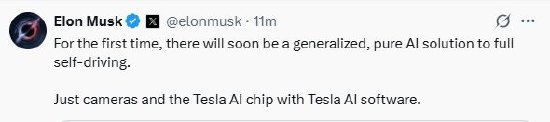 4月14日,特斯拉CEO埃隆·马斯克发文表示:“很快,将首次出现一种通用的、纯粹的人工智能解决方案,用于实现完全自动驾驶。仅需摄像头,以及搭载特斯拉人工智能软件的特斯拉人工智能芯片。”