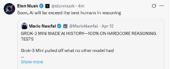 随后,马斯克转发了一条关于Grok-3 Mini的贴文并称:“很快,人工智能在推理能力方面将远超最优秀的人类。”原贴文表示:“GROK-3 MINI创造了人工智能历史 —— 在硬核推理测试中成绩达到100%。”