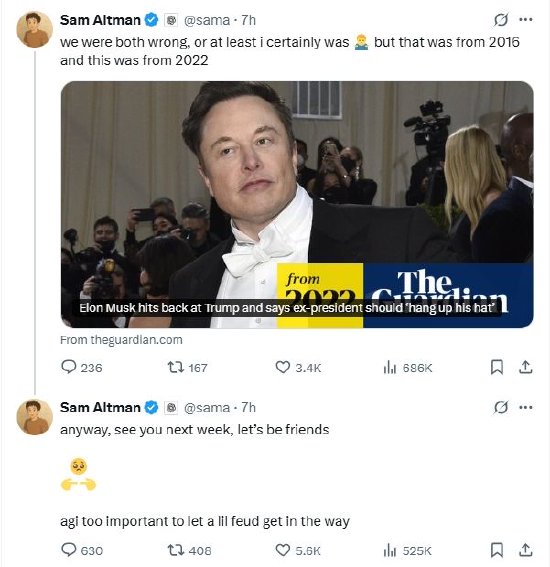 奥特曼向马斯克示好:让我们做朋友吧,AGI太重要了,别让小恩怨妨碍我们