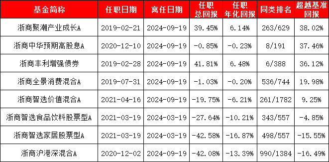 贾腾管理的浙商智选食品饮料股票型A、浙商智选家居股票型A、浙商沪港深混合A,任期均超过3年,任期分别跑输基准4.8%、15%、16%。