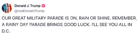 美国总统特朗普在Truth Social上表示:我们伟大的军事阅兵照常进行,风雨无阻。记住,雨中阅兵会带来好运。我在华盛顿等你们所有人。