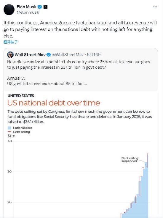 马斯克评论称:“如果这种情况继续下去,美国就会走向事实上的破产,所有的税收收入都将用于支付国债的利息,没有任何东西可以用来做其他事情。”