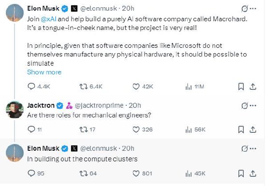 马斯克在X上发帖称“加入xAI,帮助建立一家名为Macrohard的纯人工智能软件公司。这是一个半开玩笑的名字,但这个项目是非常真实的!原则上,考虑到像微软这样的软件公司本身不生产任何物理硬件,应该有可能完全用人工智能来模拟它们。”