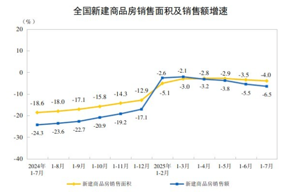 8月15日,国家统计局发布2025年1~7月份全国房地产市场基本情况。1~7月份,全国房地产开发投资53580亿元,同比下降12.0%;其中,住宅投资41208亿元,下降10.9%。新建商品房销售面积51560万平方米,同比下降4.0%;其中住宅销售面积下降4.1%。新建商品房销售额49566亿元,下降6.5%。