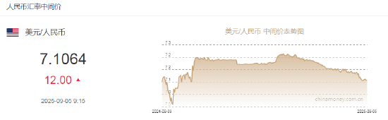 9月5日,人民币兑美元中间价报7.1064,下调12.00点。