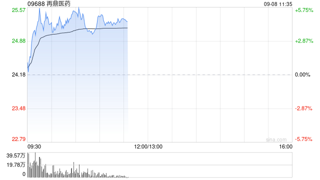 再鼎医药(09688)盘中涨超5%,截至发稿,股价上涨4.30%,现报25.22港元,成交额2.84亿港元。