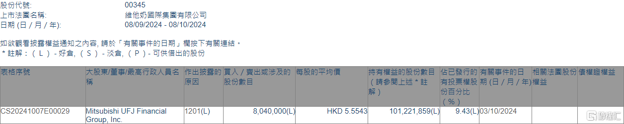格隆汇10月8日丨根据联交所最新权益披露资料显示,2024年10月3日,维他奶(00345.HK)遭Mitsubishi UFJ Financial Group, Inc.在场内以每股均价5.5543港元减持804万股,涉资约4465.66万港元。