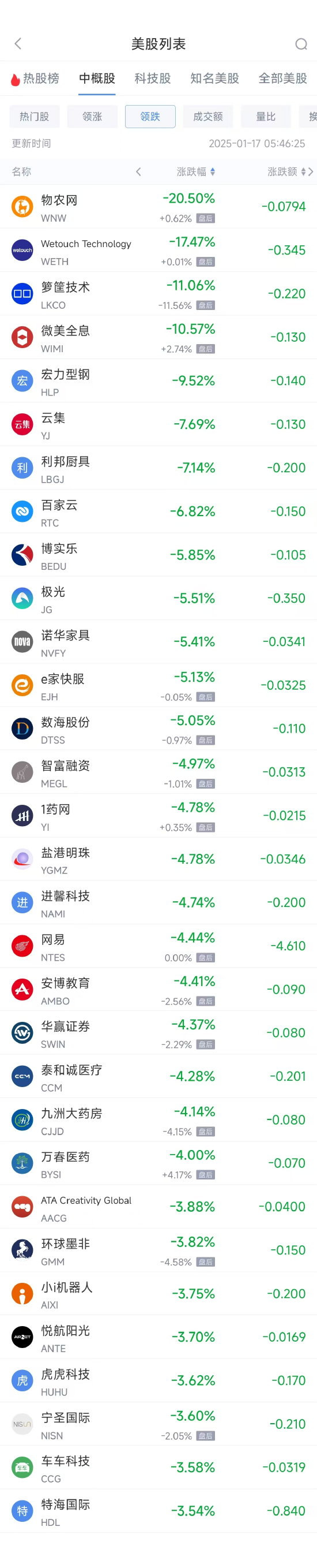 下跌股当中(按市值降序排列),阿里巴巴跌0.01%,拼多多跌0.44%,网易跌4.44%,百度跌0.94%,腾讯音乐跌0.95%,联电跌2.20%,中国新城农村跌6.08%,华住酒店集团跌2.38%,唯品会跌0.75%,极氪跌0.97%,BOSS直聘跌1.07%。