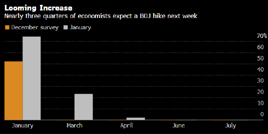 日本央行1月24日将结束为期两天的政策会议并公布利率决策。彭博对53位经济学家的调查结果显示,约74%的受访者预计届时日本央行将加息,远高于前一次调查显示的52%。约23%的受访者预计央行将在3月份行动。