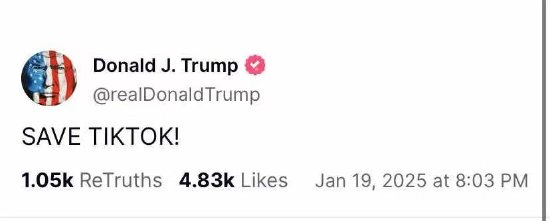 北京时间1月19日晚8时,美国候任总统特朗普在他的社交账号上发了一则帖文,内容为:“挽救TikTok!”
