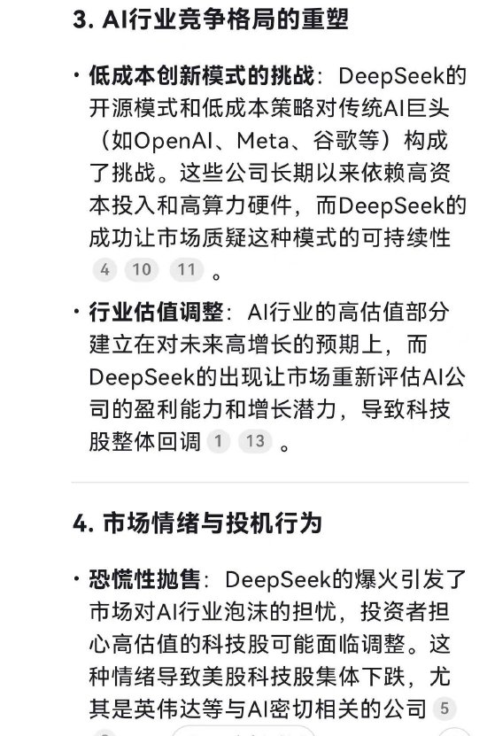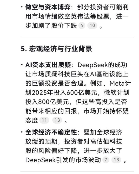 有趣的是,让DeepSeek分析美股英伟达大跌的原因,它列出了多条原因,包括“DeepSeek的技术突破引发市场恐慌”等。