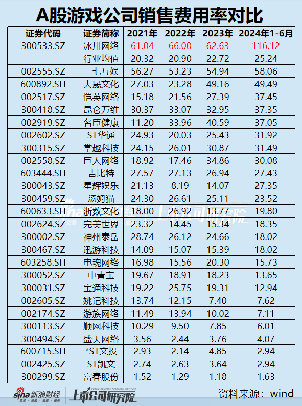Wind数据显示,A股26家游戏上市公司中,冰川网络的销售费用率高居榜首,遥遥领先于同行;三七互娱(维权)排名第二,销售费用率为58%,仅是冰川网络的一半,行业平均销售费用率更是只有25%。