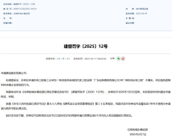 《5D调查》搜索发现,2月7日,该公司曾因申请机电工程施工总承包一级资质所使用的代表工程业绩“广东启新模具有限公司3#厂房机电安装工程”不属实,存在提供虚假材料申请企业资质的行为被住建部通报警告,并1年内不得再次申请该行政许可。