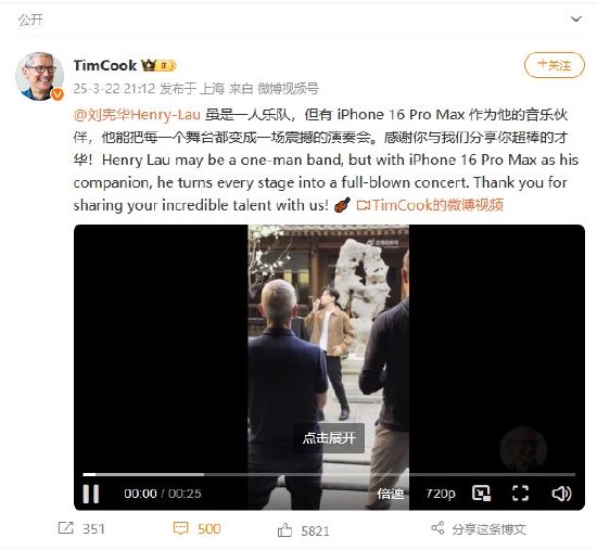 库克表示,刘宪华虽是一人乐队,但有 iPhone 16 Pro Max 作为他的音乐伙伴,他能把每一个舞台都变成一场震撼的演奏会。感谢你与我们分享你超棒的才华!