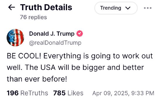 美国总统特朗普在社交媒体发文称:“保持冷静!一切都会顺利解决。”