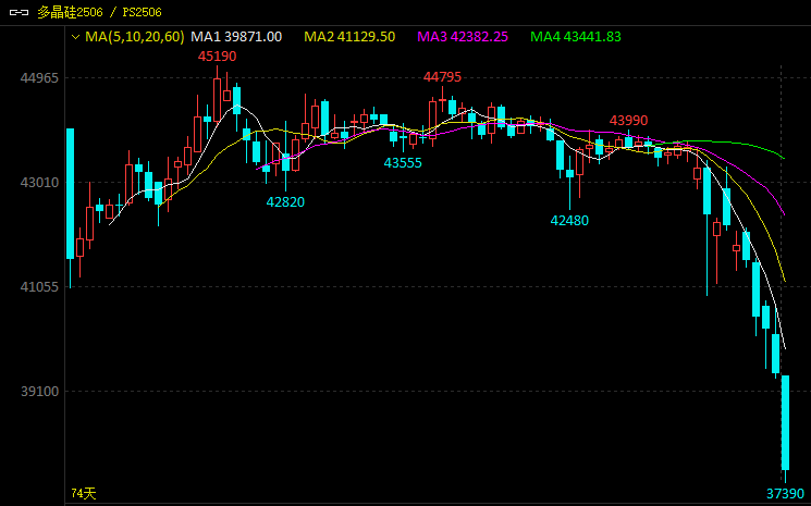 近期,多晶硅期货持续走弱。本周,多晶硅期货主力PS2506合约已连续5个交易日下行。4月18日,PS2506合约盘中跌至37390元/吨,再创上市以来新低,收盘报37615元/吨,下跌6.35%。据了解,4月份以来,PS2506合约已累计下跌13.53%。