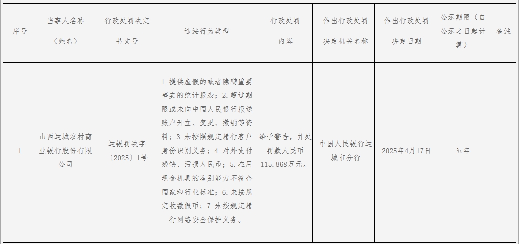 山西运城农村商业银行被罚逾115万元,涉及提供虚假的或者隐瞒重要事实的统计报表等7项违法行为