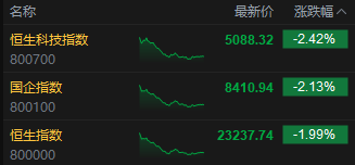 6月19日消息,港股三大指数低开低走。截至收盘,恒生指数跌1.99%,报23237.74点,恒生科技指数跌2.42%,国企指数跌2.13%。盘面上,科网股普跌,京东集团、哔哩哔哩、快手、美团跌超3%;黄金股下挫,中国白银集团跌超12%;中资券商股走低,中金公司跌超5%;创新药概念全线下跌,再鼎药业跌超6%;新消费概念股集体调整,老铺黄金、毛戈平跌超6%。