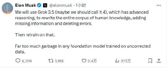 特斯拉CEO埃隆·马斯克在X上发帖称:“我们将使用Grok 3.5(或许我们应该称其为4),它具备先进的推理能力,来重新编写人类全部的知识体系,补充缺失的信息并删除错误之处。然后就用这个数据集进行重新训练。任何基于未经修正数据训练的基础模型中都存在过多的垃圾信息。”