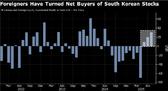 截至今年 4 月海外基金连续九个月抛售韩国股票,如今正重新大量涌入该市场。包括高盛集团、摩根大通、花旗集团和摩根士丹利在内的全球银行的策略师们自 6 月起就上调了对韩国的评级。基准的韩国综合股价指数在 2025 年上涨了 33%,推动股市市值三年来首次超过 2 万亿美元。仅在 7 月份,来自外国资金的净流入就已超过 30 亿美元。这一数字超过了前两个月外国投资者的总买入额。