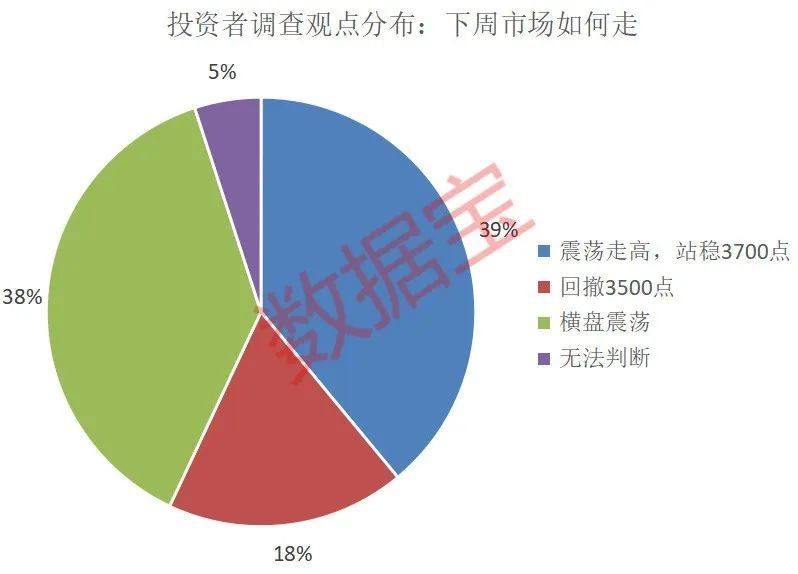 多数受访者对于下周大盘走势观点积极。认为“震荡走高,站稳3700点”的占比39%,态度较为乐观;部分受访者认为大盘将进入整理阶段,“横盘震荡”占比38%;另有部分受访者认为大盘上冲动能不足,将向下验证3500点,持有“回撤3500点”的观点占比18%。