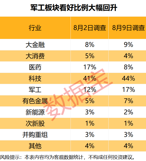 对于下周A股市场的潜力板块和方向选择,军工板块环比暴涨5个百分点至17%,是受访者最为看好的板块;科技板块紧随其后,看好比例上涨3个百分点至44%。医药板块则大幅下滑9个百分点,最新为8%。