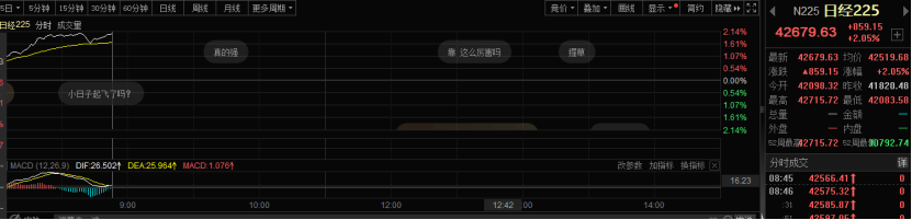 今早,日经225指数高开高走,一度上涨超2%,至42600点上方,升破了该指数在2024年7月创下的历史最高收盘纪录。
