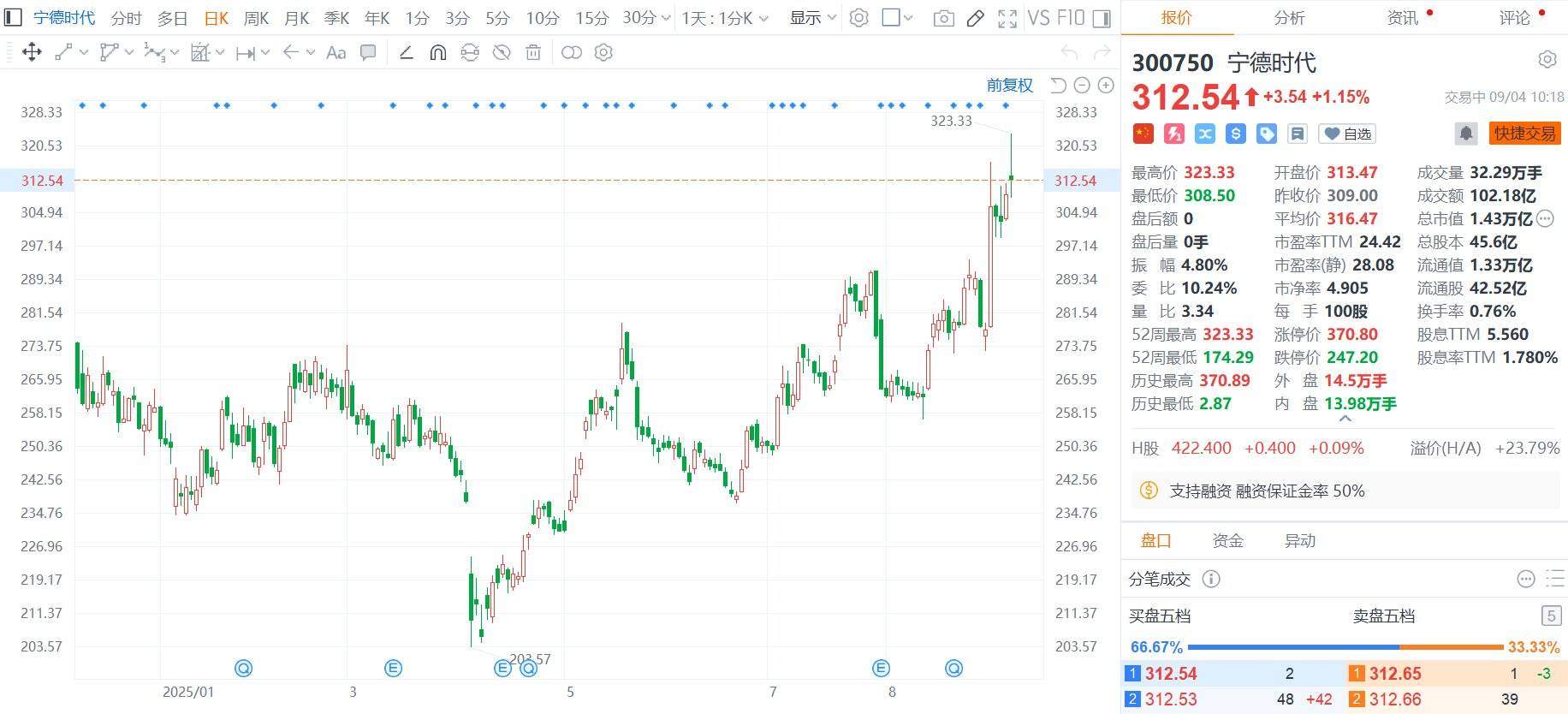 格隆汇9月4日|宁德时代(300750)涨超1%,成交额突破100亿元。
