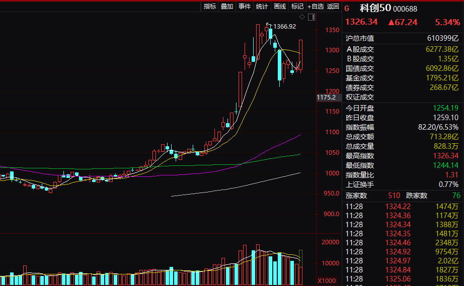科创50指数盘中涨幅超过5%,创出今年9月以来盘中最大涨幅,多只科创50指数成份股强劲上涨,推动指数走强。