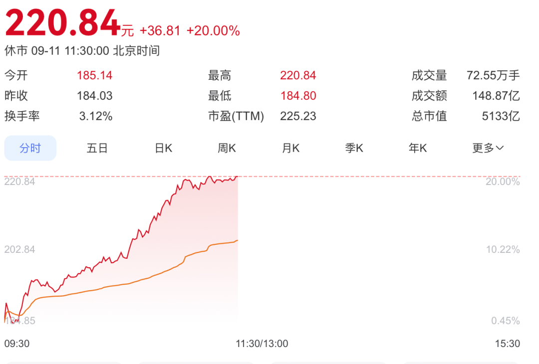 科创板权重股之一的海光信息大涨,截至午盘实现“20cm”涨停,盘中股价创出历史新高,最新股价报220.84元,总市值超过5100亿元。