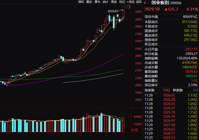 A股全线爆发 创业板指数时隔三年多重返3000点之上