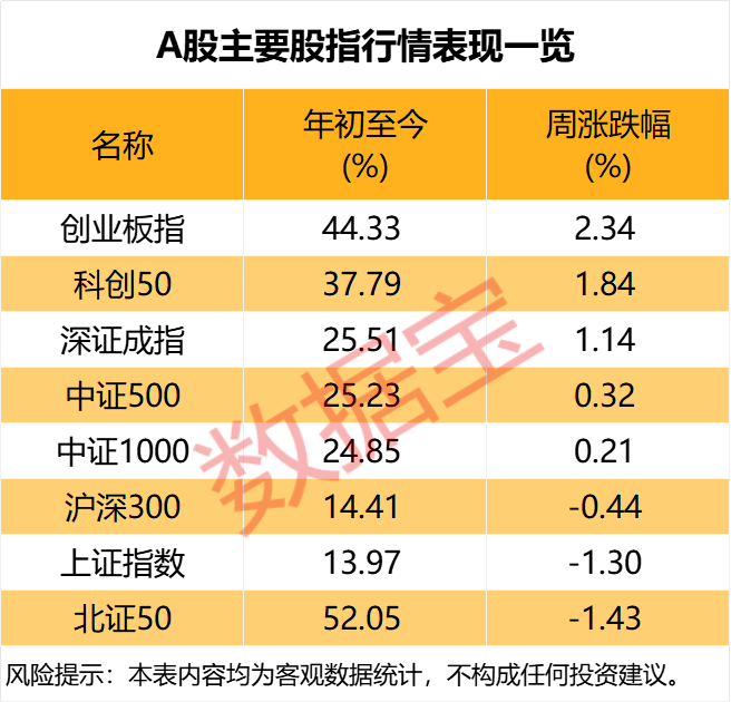 本周(9月15日至19日),A股市场成交规模维持高位,连续5日在2.3万亿元以上。指数方面,沪指一周下跌1.3%,最新报3820.09点;深证成指上涨1.14%,创业板指上涨2.34%,科创50指数上涨1.84%;北证50指数跌幅居前,为1.43%。