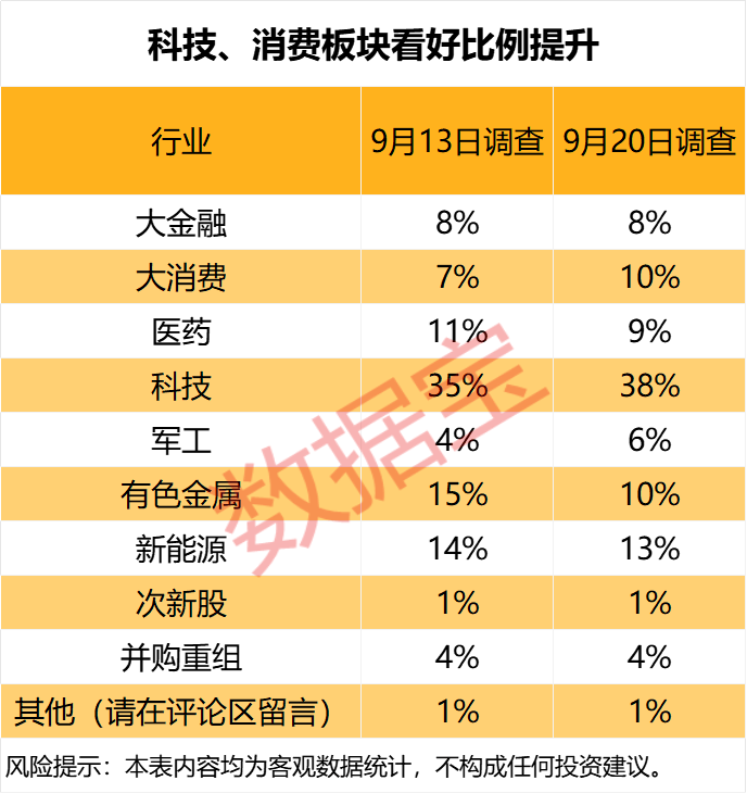 对于下周A股市场的潜力板块和方向选择,科技、大消费板块均环比提升3个百分点,最新分别为38%、10%,是受访者较为看好的板块。有色金属板块则大幅下滑5个百分点,最新为10%。