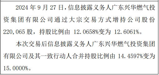 本次交易后信息披露义务人广东兴华燃气投资集团有限公司及其一致行动人合并持股比例由14.4597%变为15%。