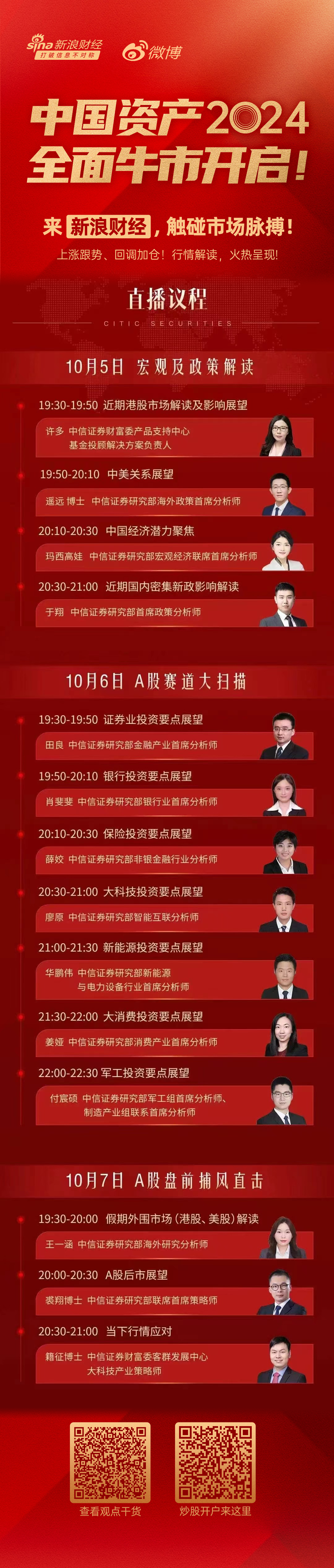 10月5日19:30至21:00,中信证券财富委产品支持中心基金投顾解决方案负责人许多,中信证券研究部海外政策首席分析师遥远博士,中信证券研究部宏观经济联席首席分析师玛西高娃,中信证券研究部首席政策分析师于翔,直播分享宏观及政策解读。视频直播