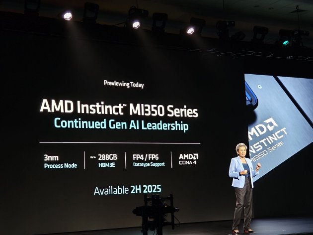 除了Instinct MI325X GPU加速器,AMD还预告了Instinct MI350系列,它是前者的继任者,采用3纳米制程,全新的CDNA 4架构,内存容量提升至288GB,内存带宽提升至8TB/s。平台级别的产品中,内存容量超过2.2TB,FP6和FP4下可实现74 PF的计算。