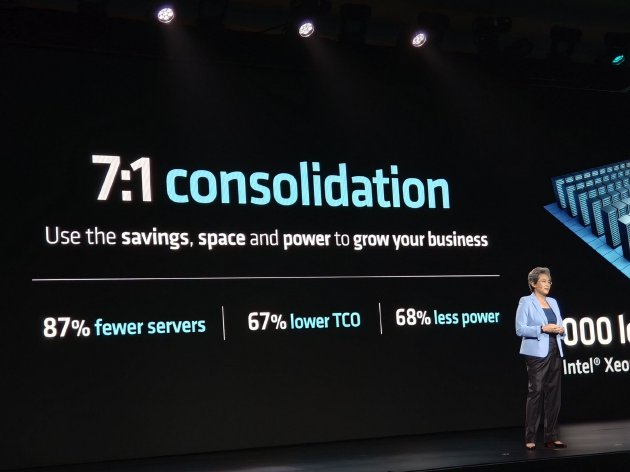 性能提升之外,AMD瞄准了那些4年未更新的数据中心。官方宣称,现在客户可以使用131个服务器代替上千个数年前的服务器,来实现后者所有功能。这样做的直接好处就是,降低了68%的功耗,减少了87%的服务器数量,进而降低客户的成本。并且AMD提供了一套完整的迁移工具,就怕客户嫌麻烦不买账。