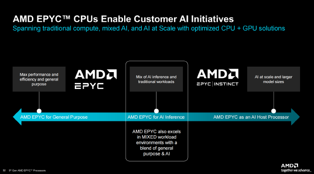 如果你买了昂贵的GPU用来做AI,不管是AMD自家的Instinct MI300X系列,还是对面的H100系列,EPYC都可以最大化GPU的能力。而如果是CPU和GPU搭配处理AI任务,第五代AMD EPYC服务器处理器依然有优于竞争对手的表现。总之一句话就是,买了第五代AMD EPYC,你怎么用都不吃亏。