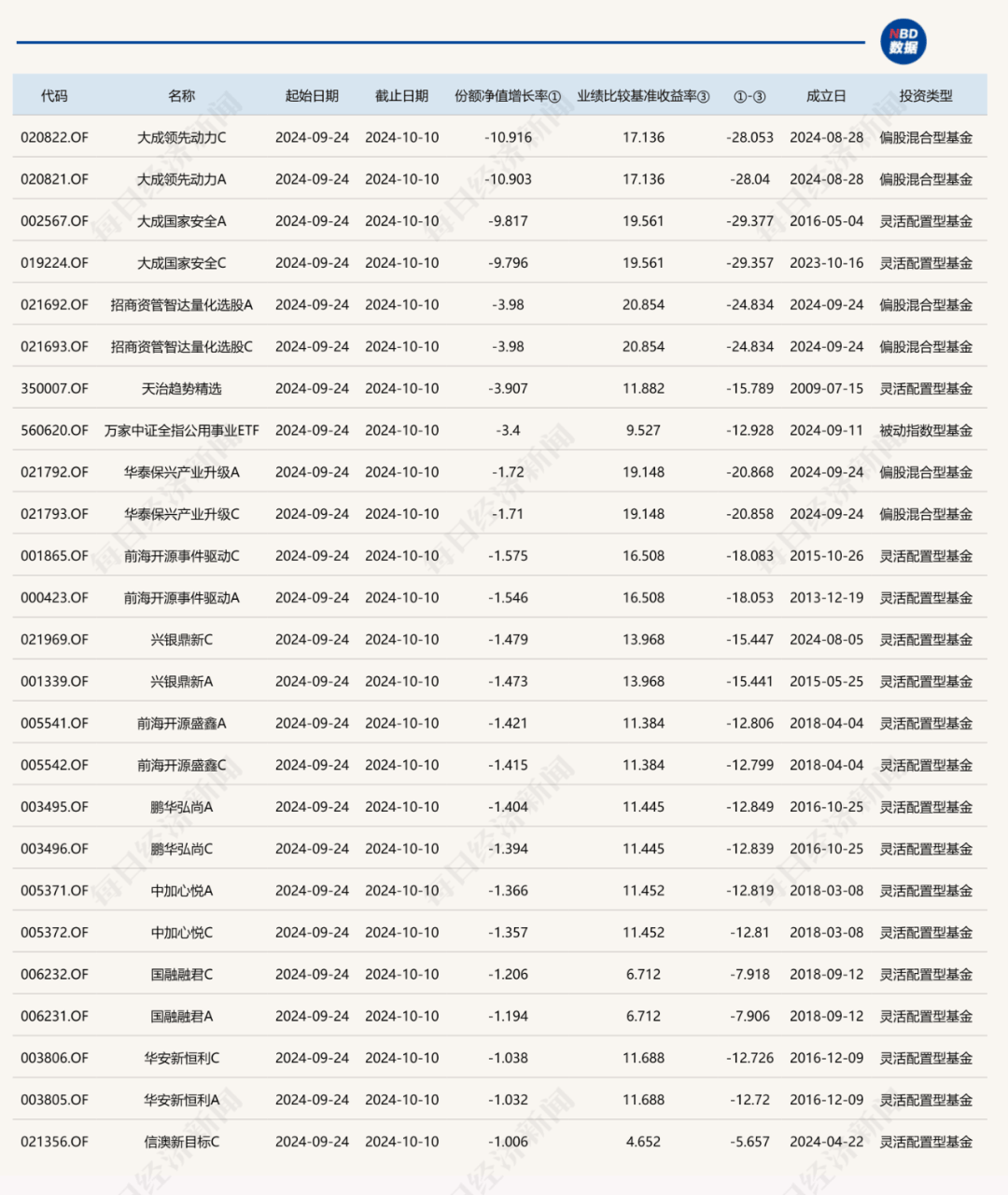 不过记者注意到,有的基金在同一时间段,收益为负数,wind数据显示,选取偏股混合型基金、被动指数型基金、灵活配置型基金和普通股票型基金,可以发现在9月24日至10月10日期间,有25只基金的跌幅超过1%,有的更是跌幅超过10%。