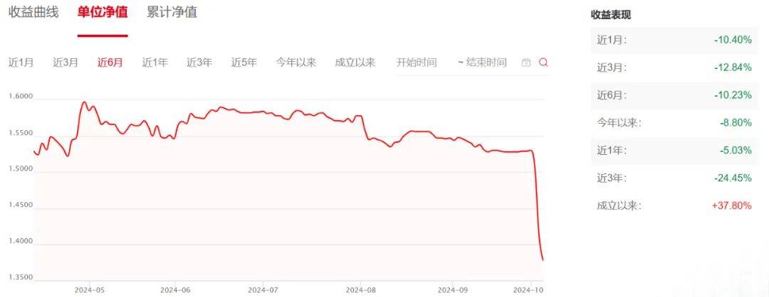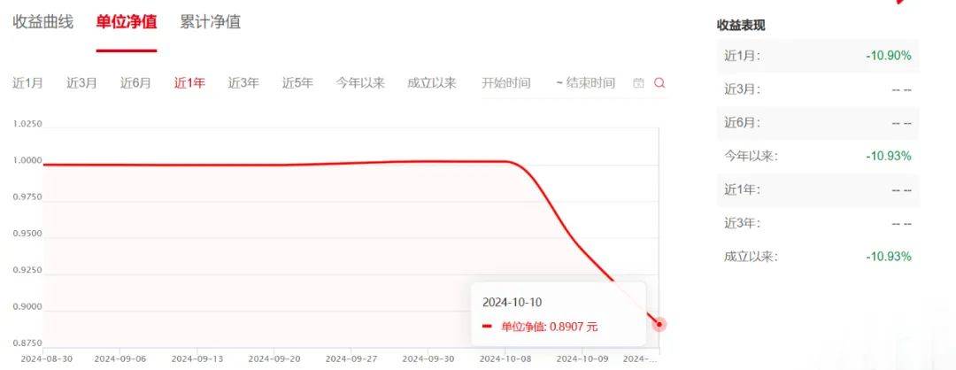 而到了10月9日时,该基金A类份额净值跌了6.04%,10月10日净值又跌了5.41%,净值跌到了0.8907元,相当于短短2天时间,跌幅超10%。