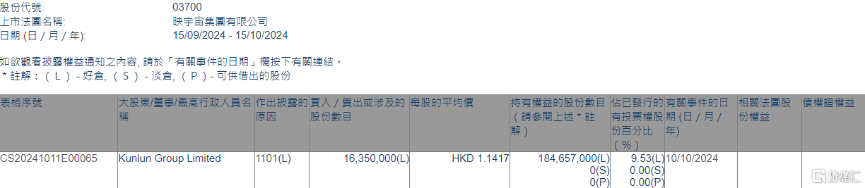映宇宙(03700.HK)获Kunlun Group增持1635万股
