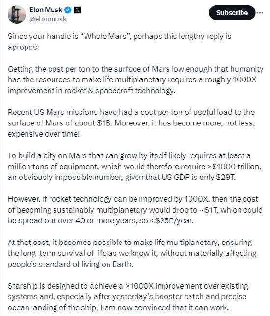 马斯克在回应网友时说,在火星上建造一座可以自行发展的城市可能需要至少100万吨的设备,以现有的技术需要1000万亿美元,这显然是不可能的,而如果将火箭技术改进1000倍,那么成为可持续的多行星生命的成本将下降到1万亿美元左右。