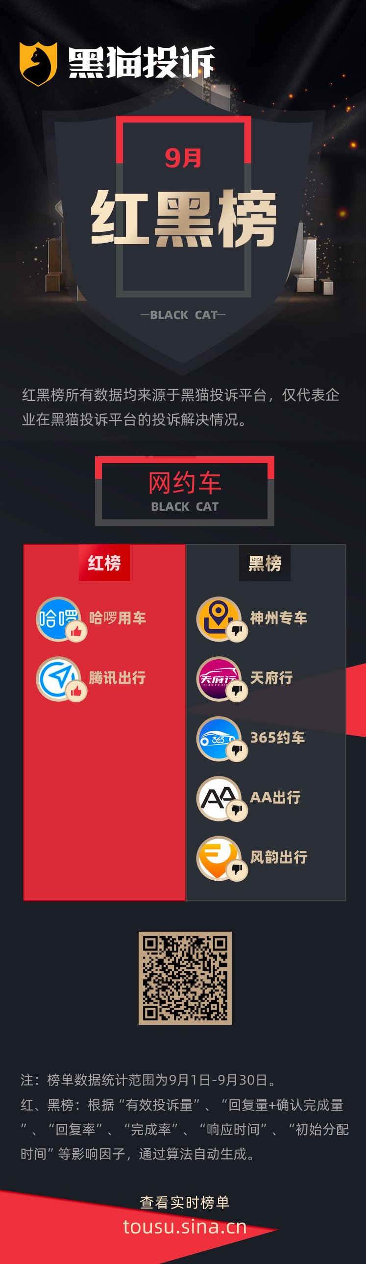 9月黑猫投诉网约车领域红黑榜:天府行未乘车不退款