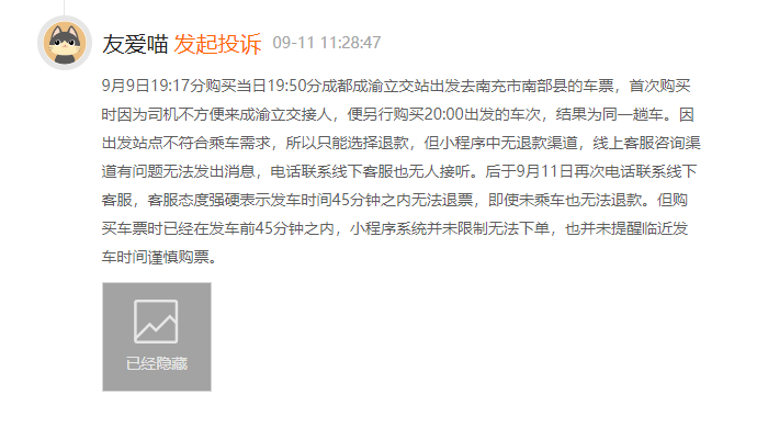 本月中有用户向黑猫投诉平台反馈:在天府行购买车票后司机表示因事无法继续提供服务,另购其他车票后却发现原车票无任何退款途径,经数次努力才与平台客服取得联络,但仅得到“发车时间45分钟之内无法退票”的回复,用户表示购票时已离发车不足45分钟也无果。截至本月末,天府行累计投诉255件,回复率为0。