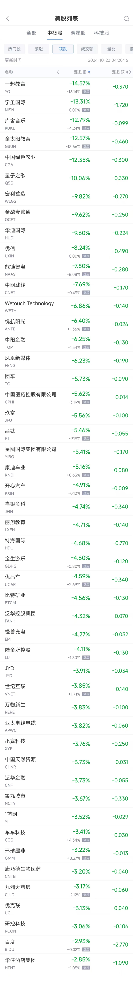下跌股当中(按市值降序排列),阿里巴巴跌1.50%,京东跌0.75%,网易跌1.37%,携程跌1.22%,百度跌2.93%,中华电信跌1.22%,贝壳跌2.70%,日月光半导体跌0.77%,中通跌0.83%,腾讯音乐跌0.93%,富途控股跌1.00%,华住酒店集团跌2.85%,新东方跌2.64%,蔚来跌1.15%,满帮跌0.08%,唯品会跌1.96%,BOSS直聘跌1.19%,WSP控股跌0.06%,极氪跌1.37%,360数科跌0.21%,亚朵集团跌0.04%。
