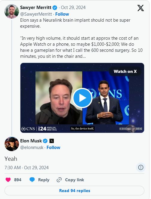 在上个月举行的2024年神经外科医生大会上,马斯克分享了他对Neuralink大脑植入物的看法,称这些设备不应该贵得离谱。