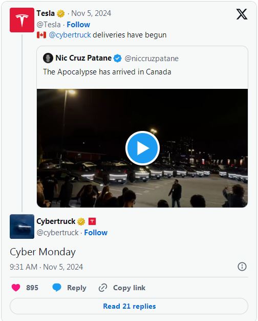 特斯拉的官方账号在X上发帖称:“加拿大的Cybertruck交付已经开始。”
