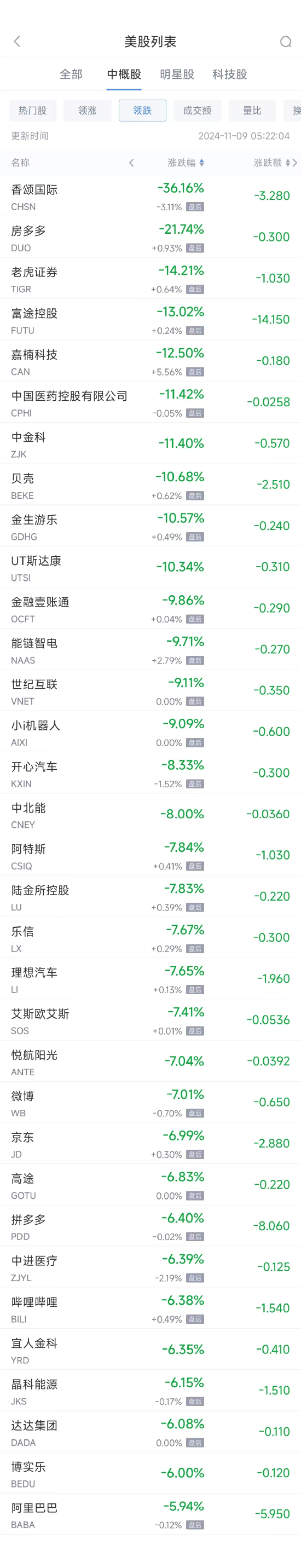 下跌股当中(按市值降序排列),阿里巴巴跌5.94%,拼多多跌6.40%,京东跌6.99%,网易跌5.45%,携程跌4.31%,百度跌4.88%,中华电信跌0.58%,贝壳跌10.70%,理想汽车跌7.65%,百济神州跌0.68%,日月光半导体跌2.61%,腾讯音乐跌3.31%,联电跌1.10%,中通跌3.60%,富途控股跌13.02%,华住酒店集团跌2.14%,蔚来跌4.24%,新东方跌1.71%,哔哩哔哩跌6.38%,满帮跌2.40%,唯品会跌5.48%,BOSS直聘跌2.87%,极氪跌2.63%,名创优品跌2.64%。
