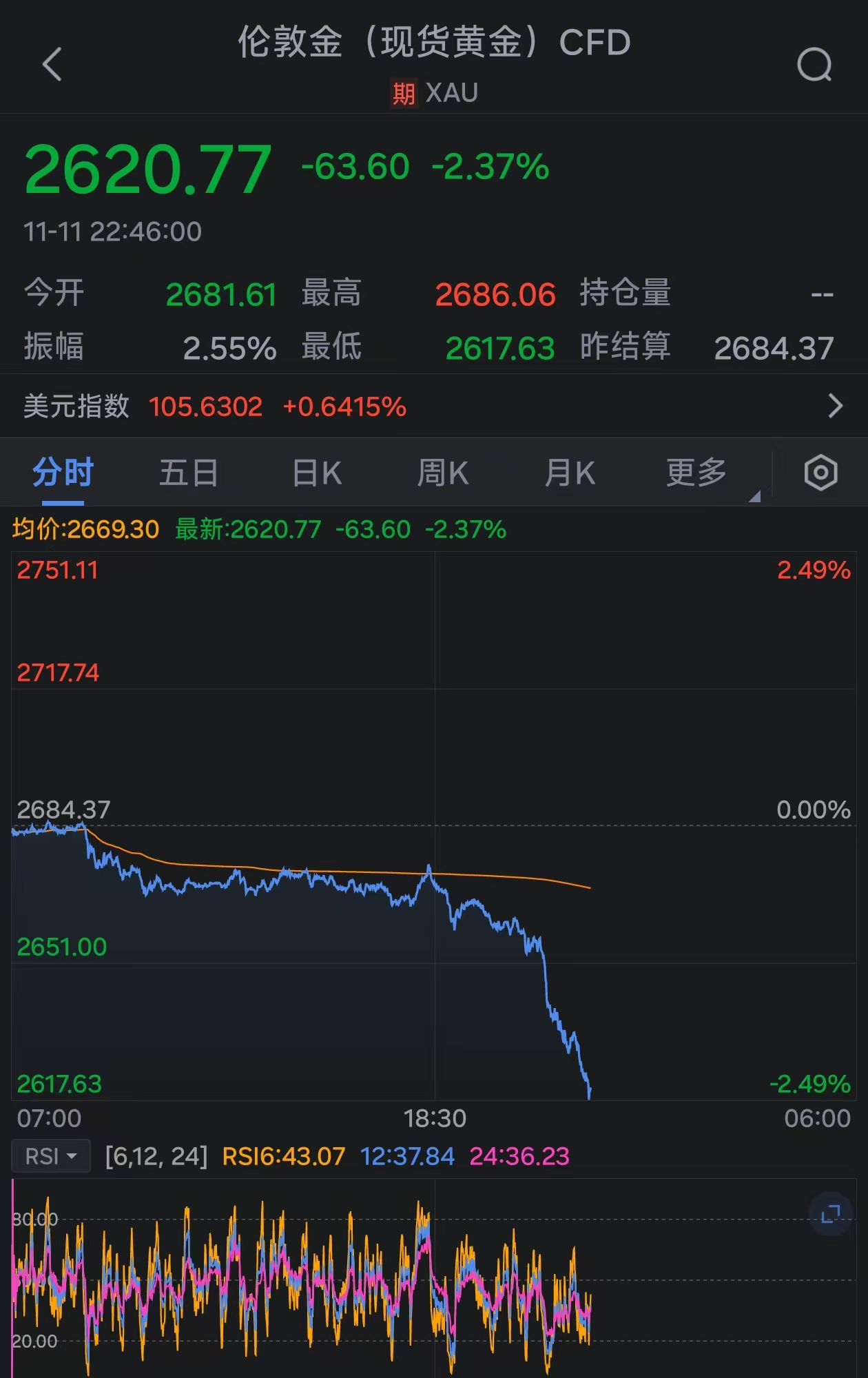 沪金主力合约日内跌超2.00%,现报605.74元/克。现货黄金跌破2620美元/盎司,日内跌2.48%。